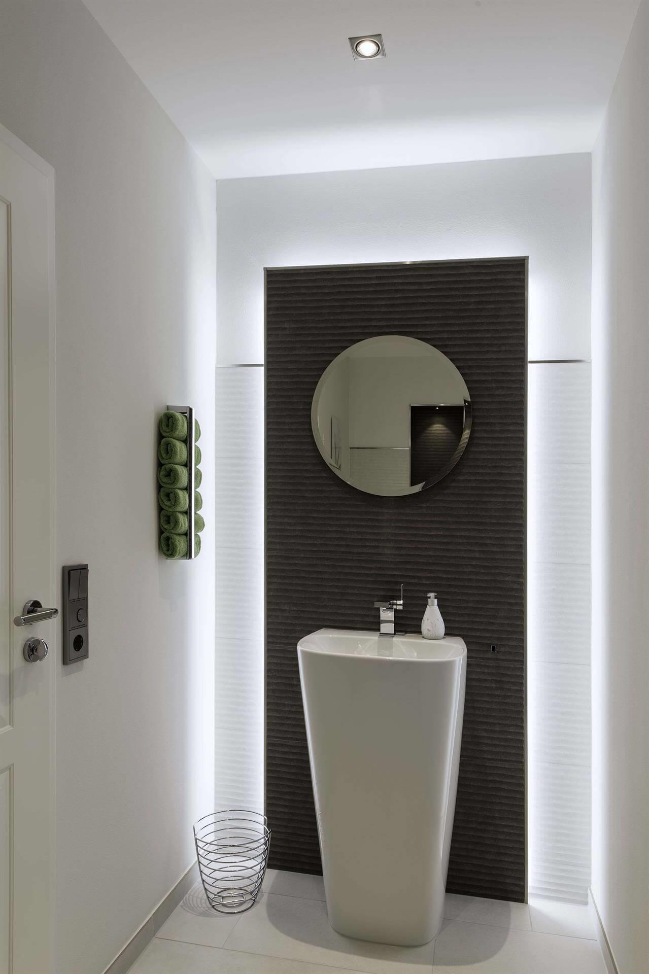 Die großformatigen Fliesen in Betonoptik, die schwarzen Armaturen, Accessoires und die in schwarz eingefasste Duschabtrennung schaffen eine tolle Atmosphäre. Abgerundet wird das Konzept durch ein intelligentes Beleuchtungskonzept mit Farbwechsel. Diese wurde in der Vorwand der Waschtischanlage integriert. So kann je nach Stimmung die passende Beleuchtungsfarbe gewählt werden.
