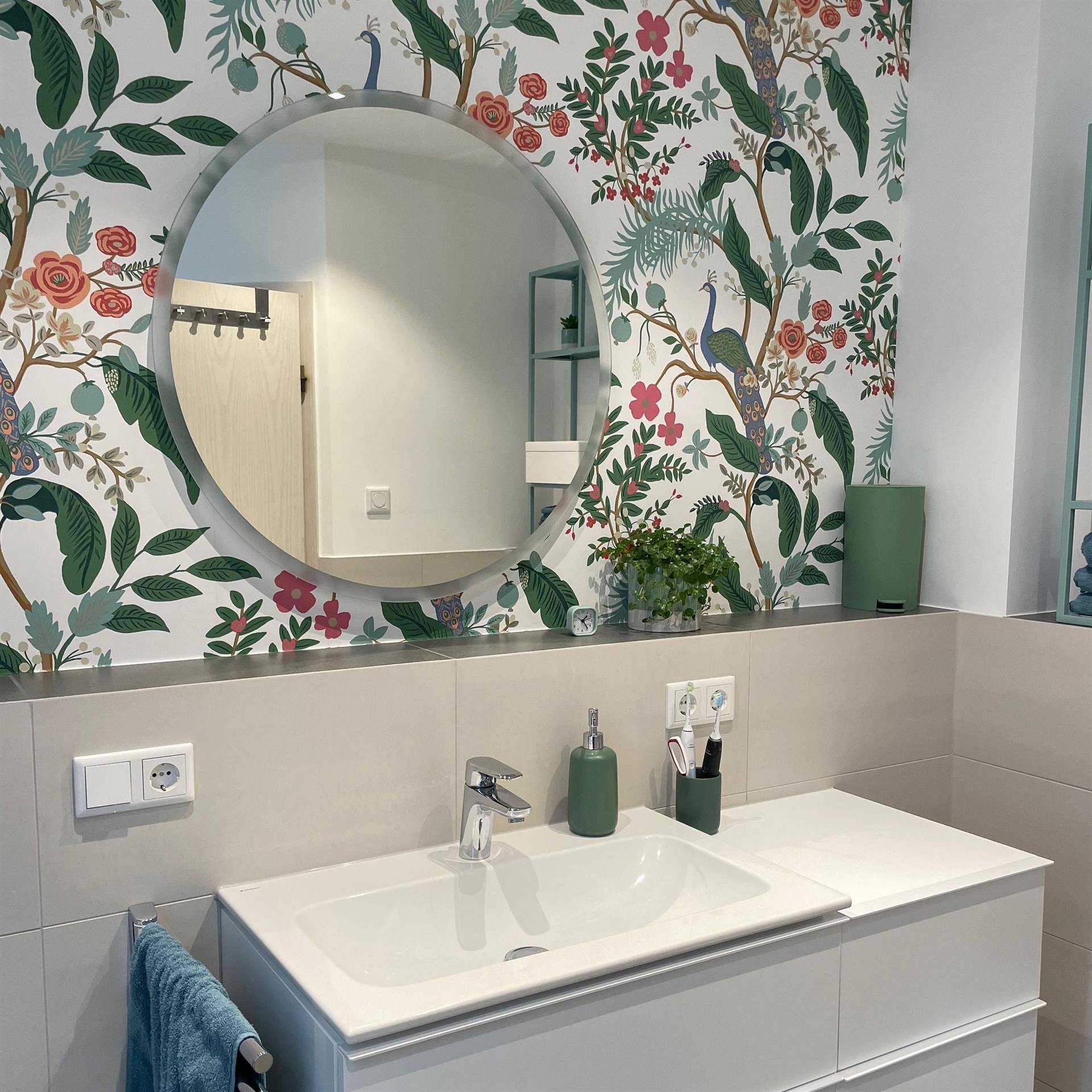 Dieses Badezimmer ist unser neuster Stolz! Die atemberaubende Tapete verleiht diesem Raum eine unverwechselbare Eleganz und schafft eine einzigartige Atmosphäre.